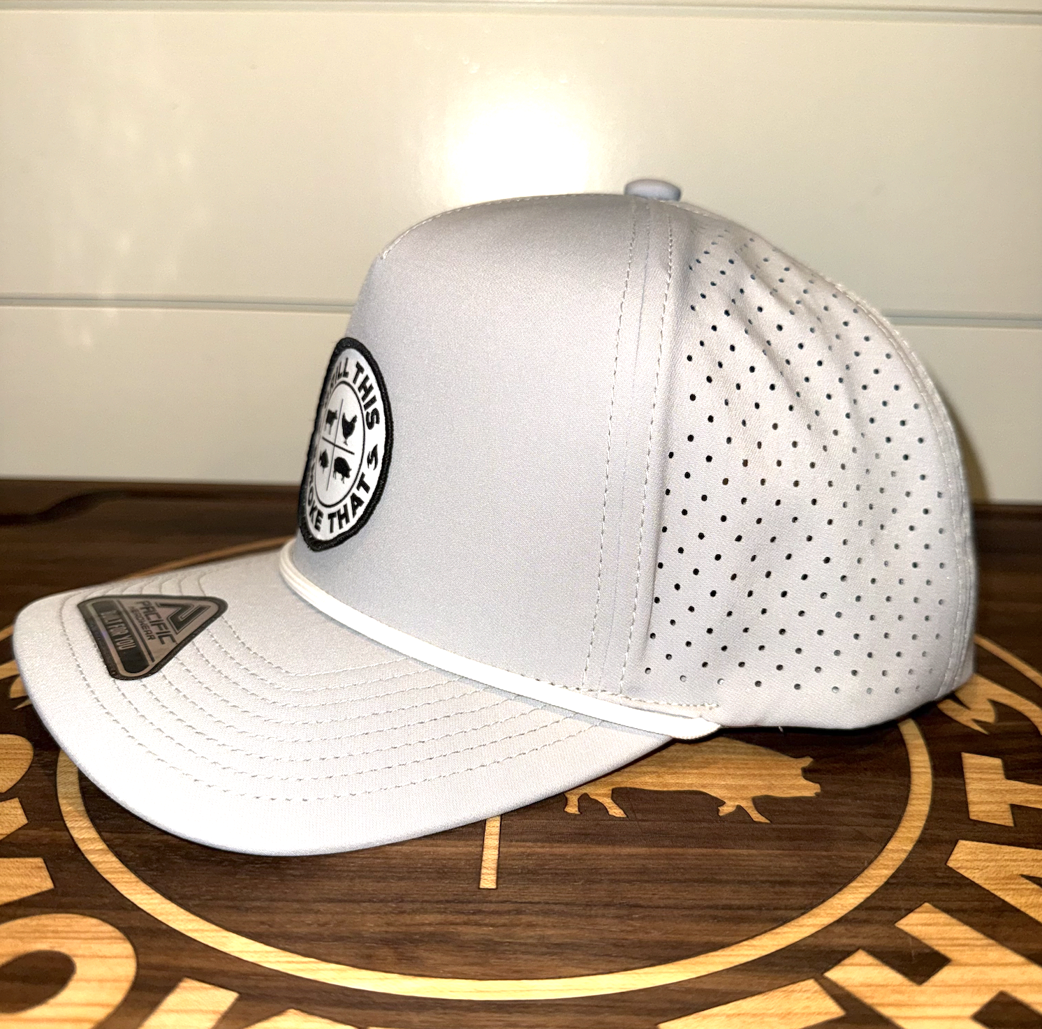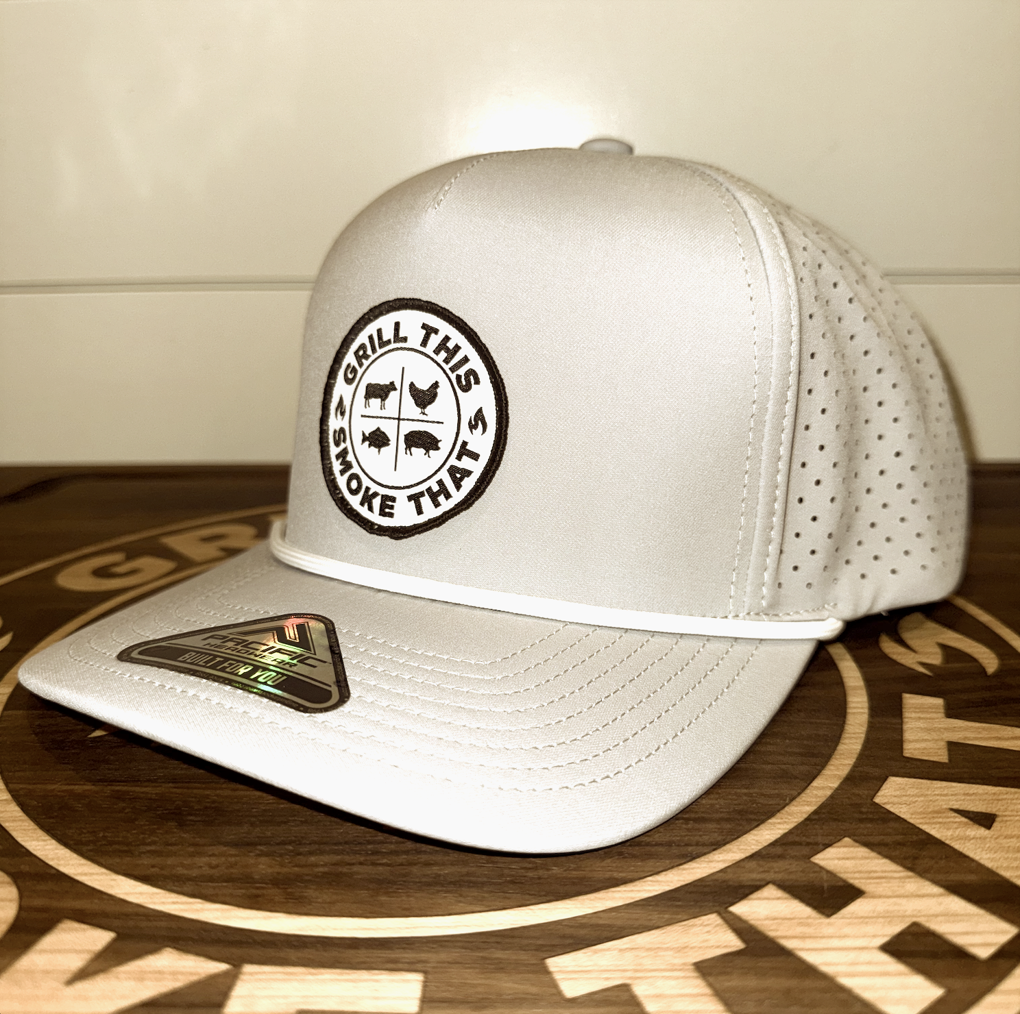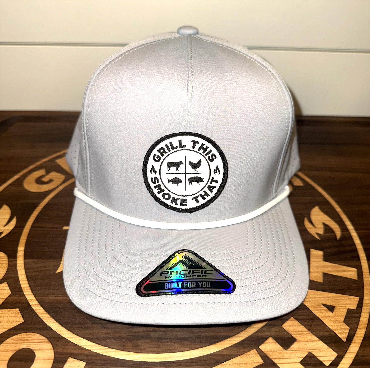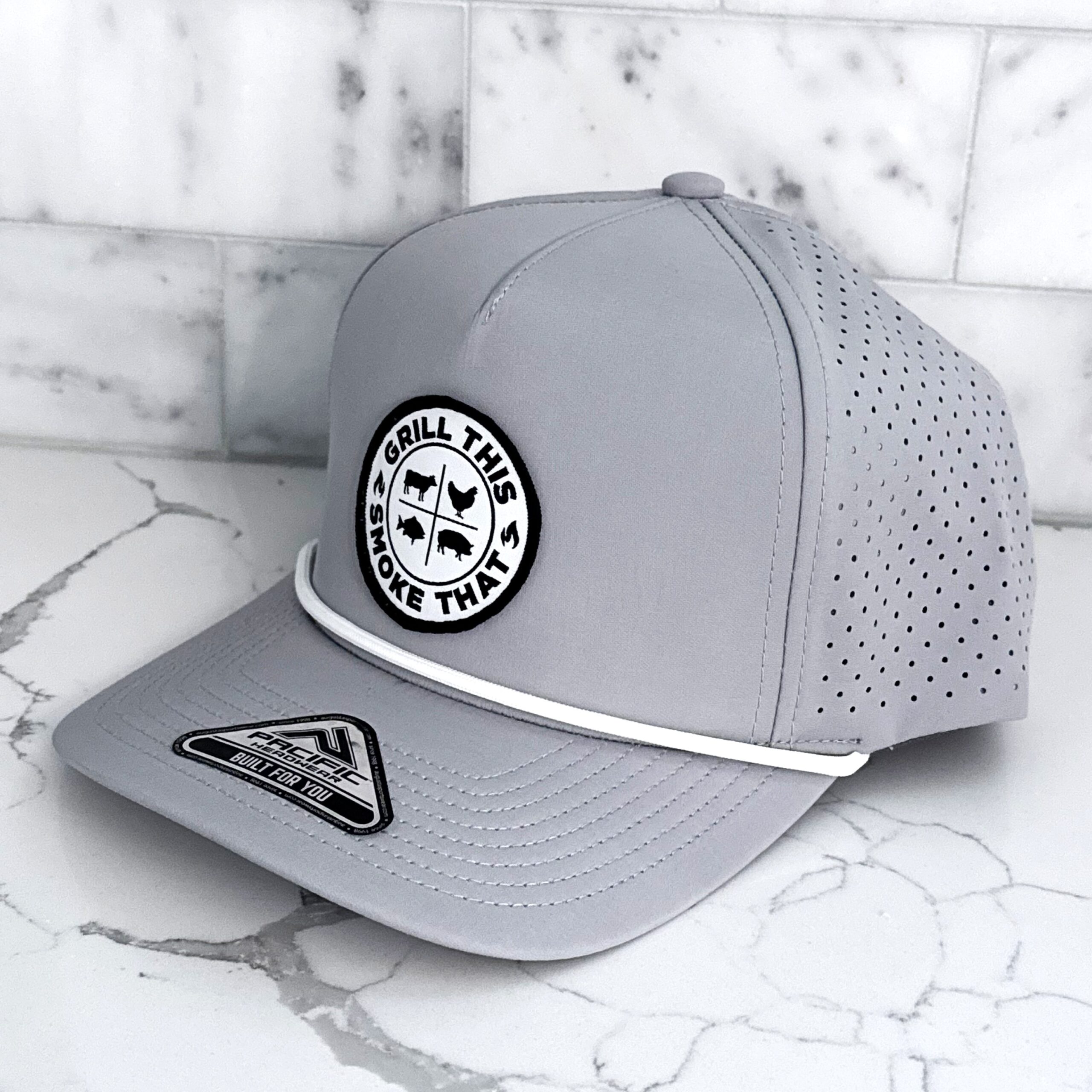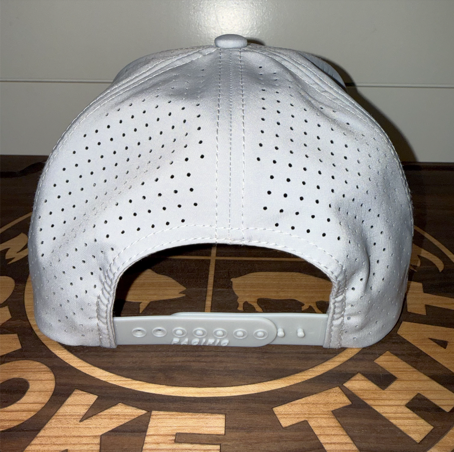 The Weekender from Pacific Headwear is a premium rope hat with vented back. Color is Light Gray with White rope.