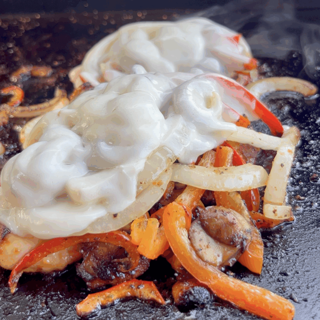 Top each one with a slice of cheese and cover with a dome to melt the cheese.